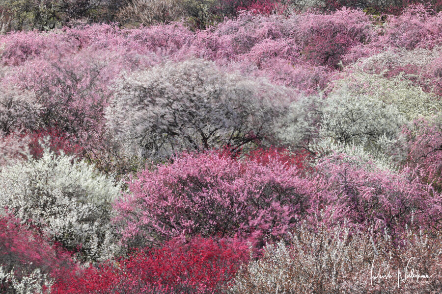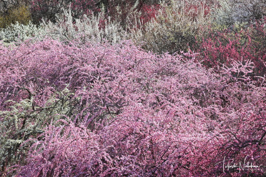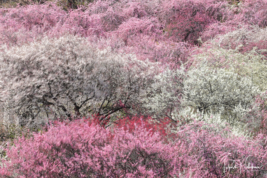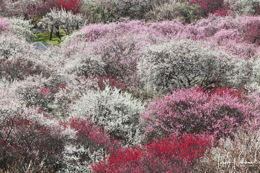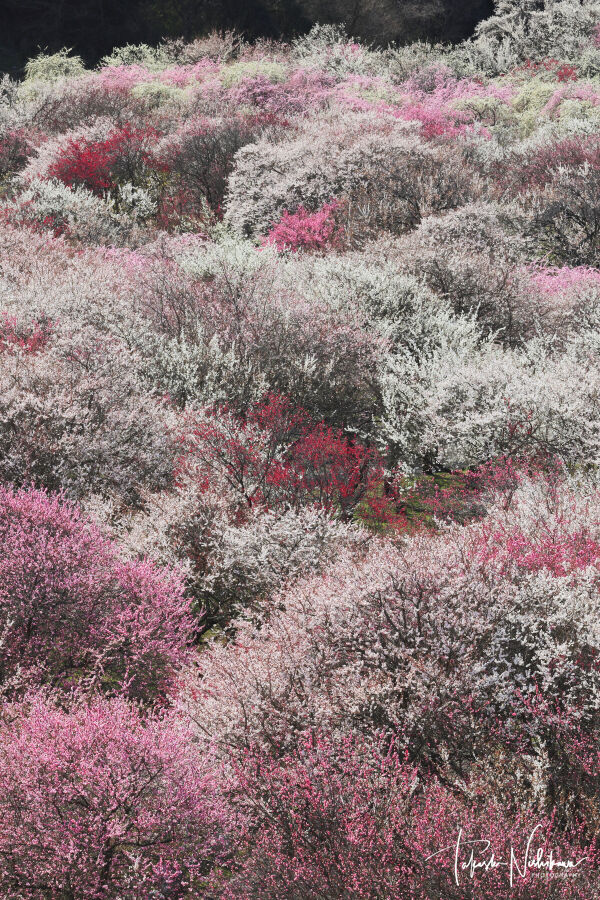 まずは展望台へ。梅林は見頃旬。ここは望遠レンズ要。