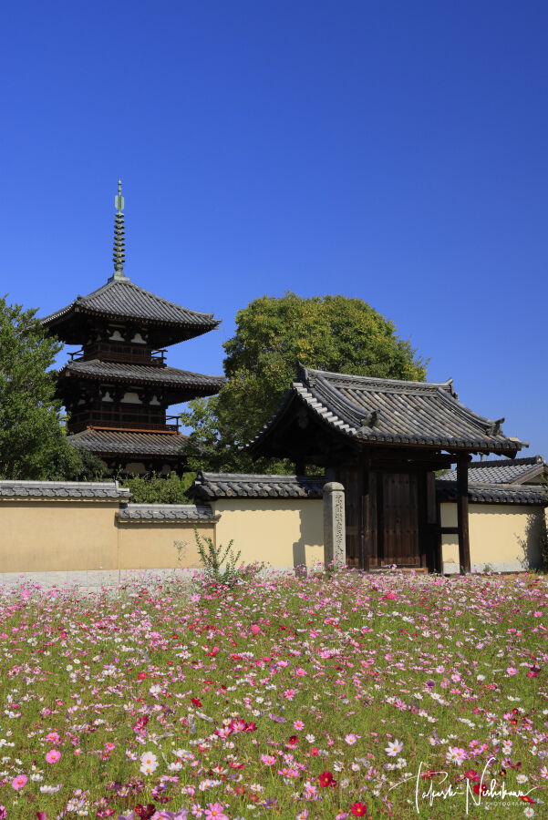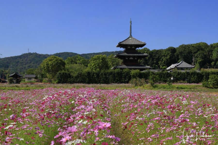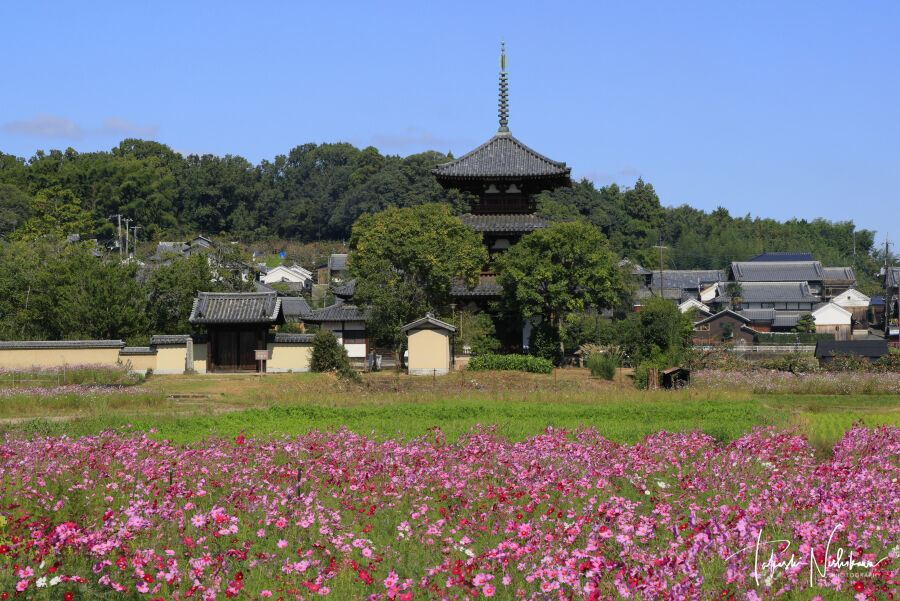 奈良県斑鳩町の法起寺の三重塔とコスモス畑 10月15日分2-1。
