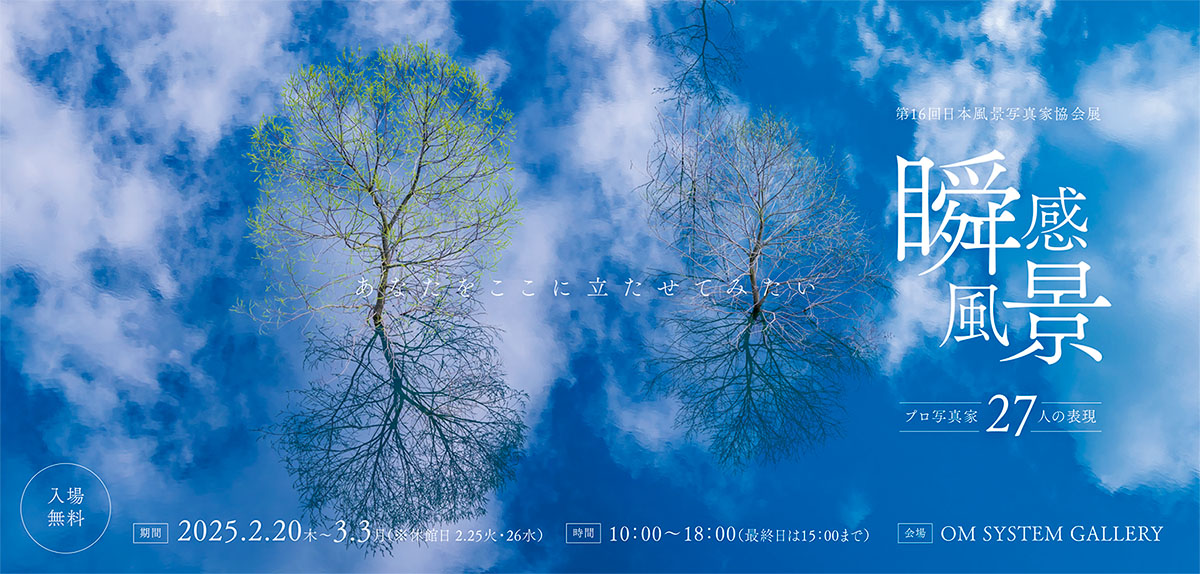 第16回を迎える今回の作品展タイトル「瞬感風景」には、全国各地で出会った一瞬の風景を逃さず捉え、自らも感動し「あなたをここに立たせてみたい」というその思いを込めました。プロ写真家27人の譲れない個性を感じていただければ幸いです。