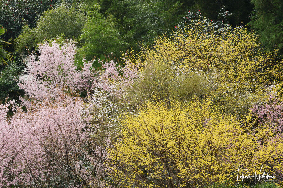 光台寺付近、白木蓮はまだ蕾だが、山茱萸や啓翁桜はもう見頃。