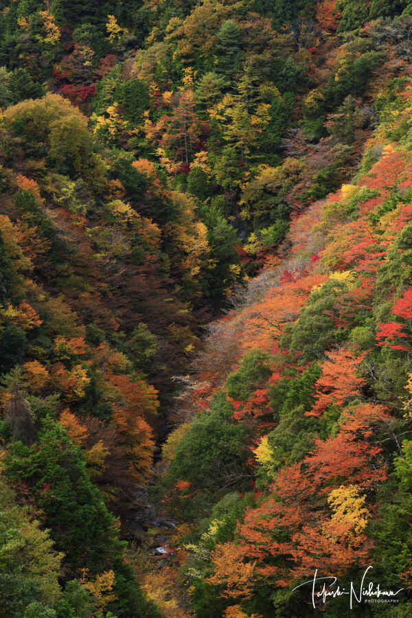 1時半ごろ、大滝付近の橋の上から望む御殿川の紅葉。見頃。路肩駐車可。