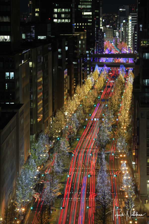 大阪府大阪市のWowUsの展望フロアから望む御堂筋のイルミネーション夜景。