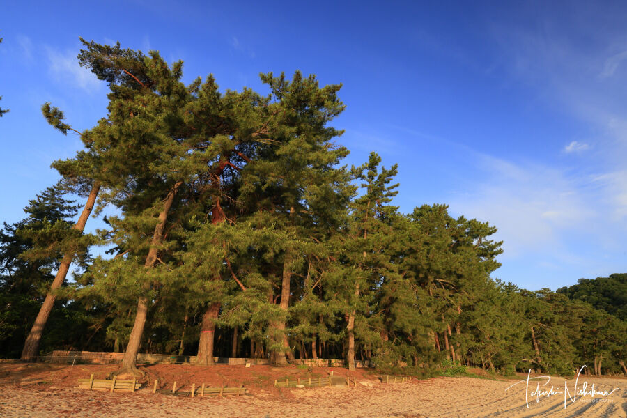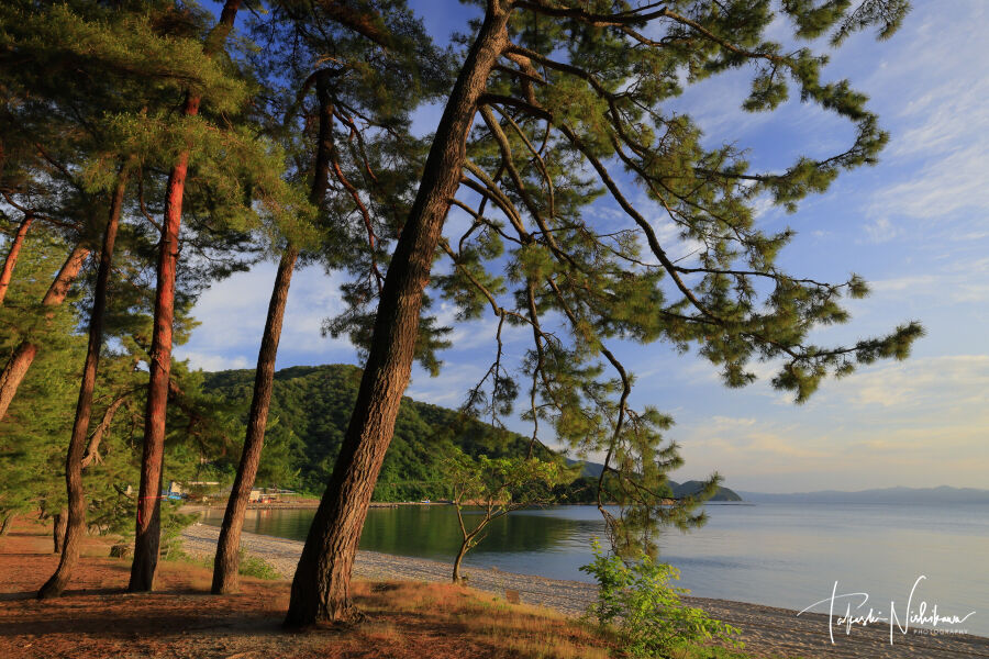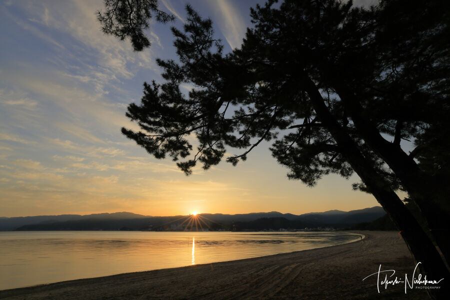 大平山へ続く国道465号線の撮影ポイントから、虫明湾と朝日を撮影。