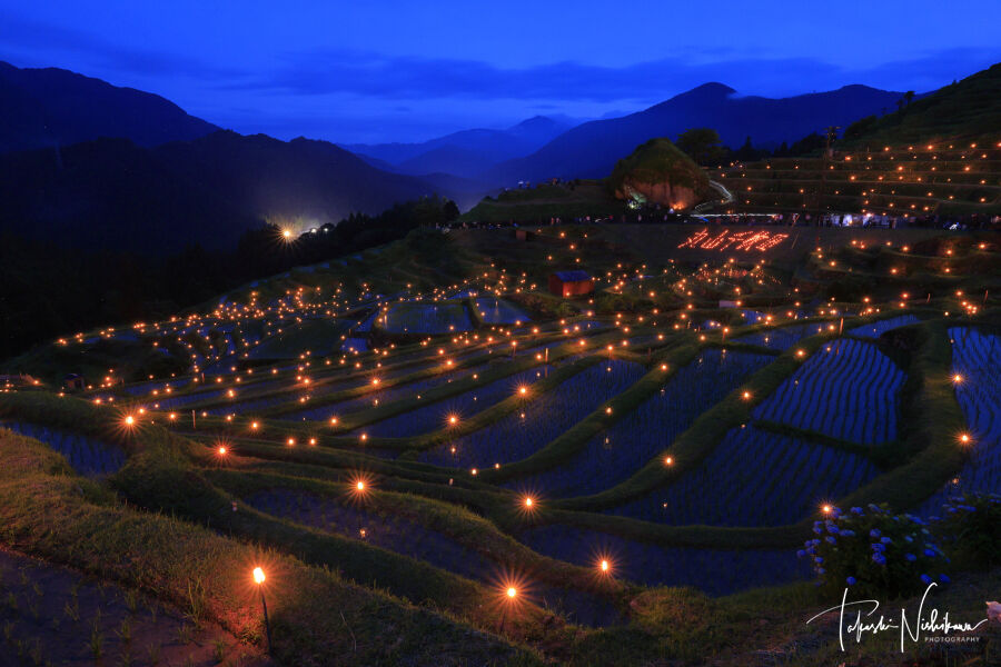 キャンドルと棚田の明るさのバランスがよくなるのは、7時40分前後。