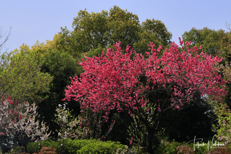 公園内の染井吉野は満開パラパラ。八重紅枝垂れ桜は見頃。