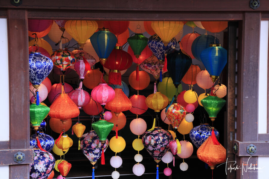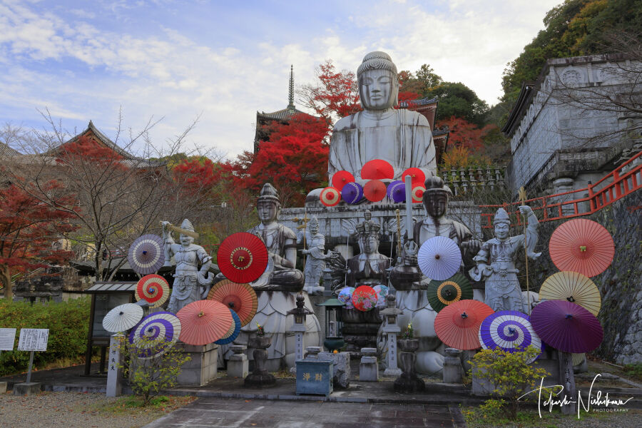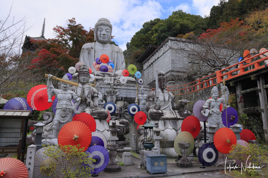 駐車場は30分300円に値上げ。拝観は800円。紅葉は見頃。和傘アートの展示あり。