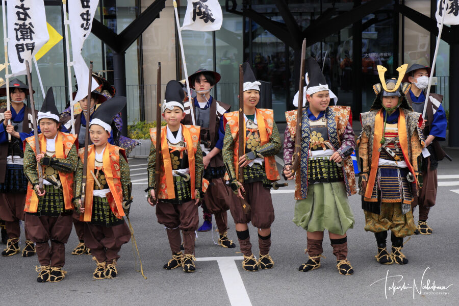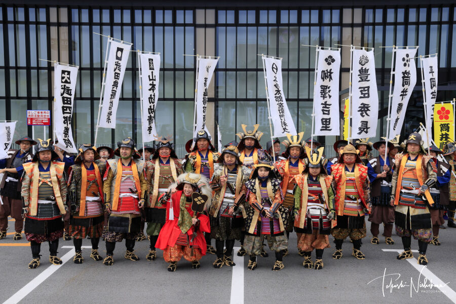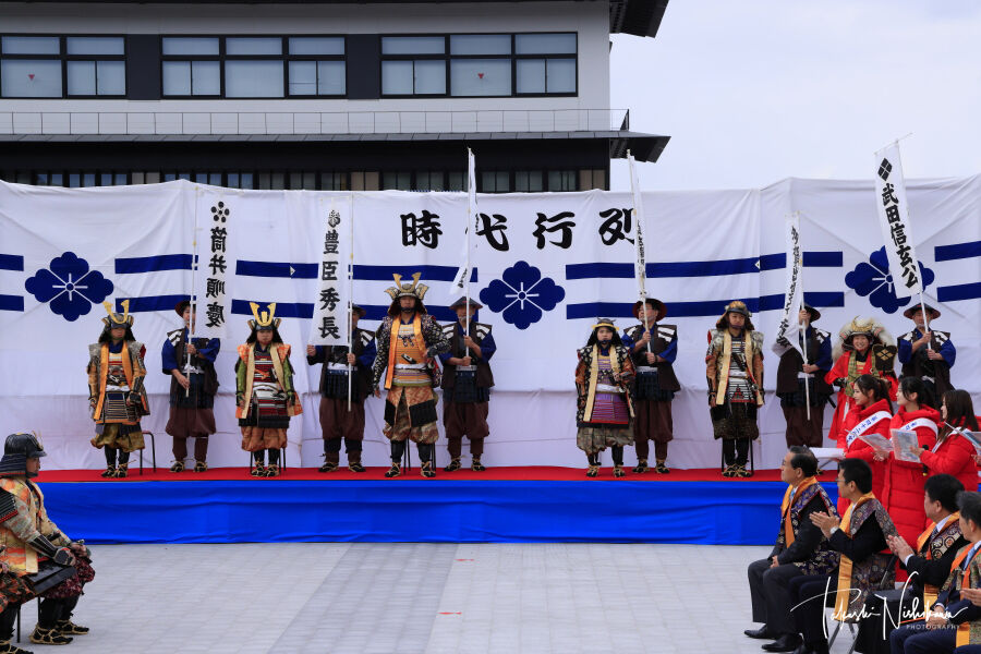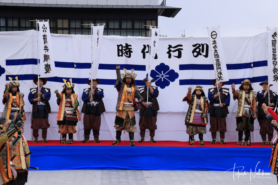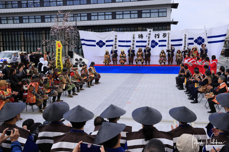 時代行列の出陣式は、市役所前で1時半から始まる。