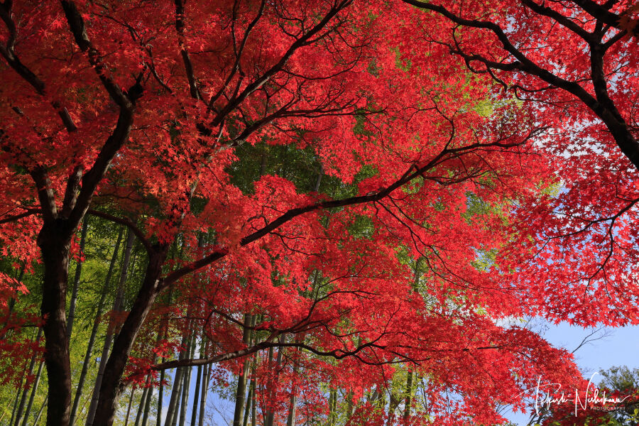 紅葉は見頃だが、竹林に囲まれ日当たりがよくない場所なので、あまり赤くはならない。