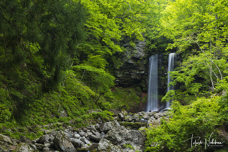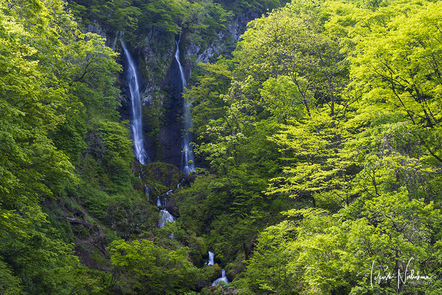 打尾川に懸かる落差38mの2本の直瀑。北西向き正面。