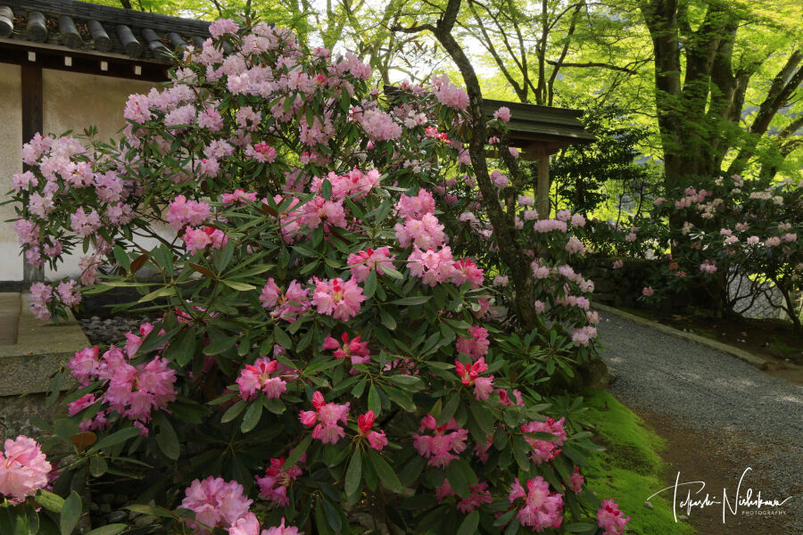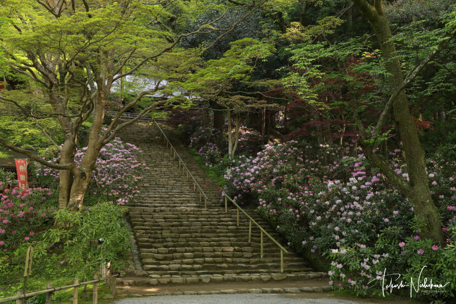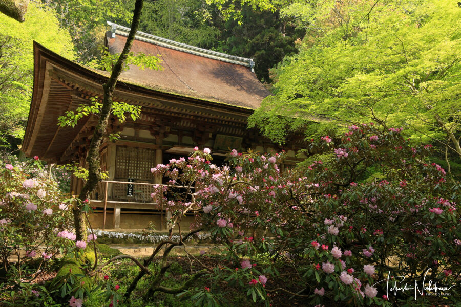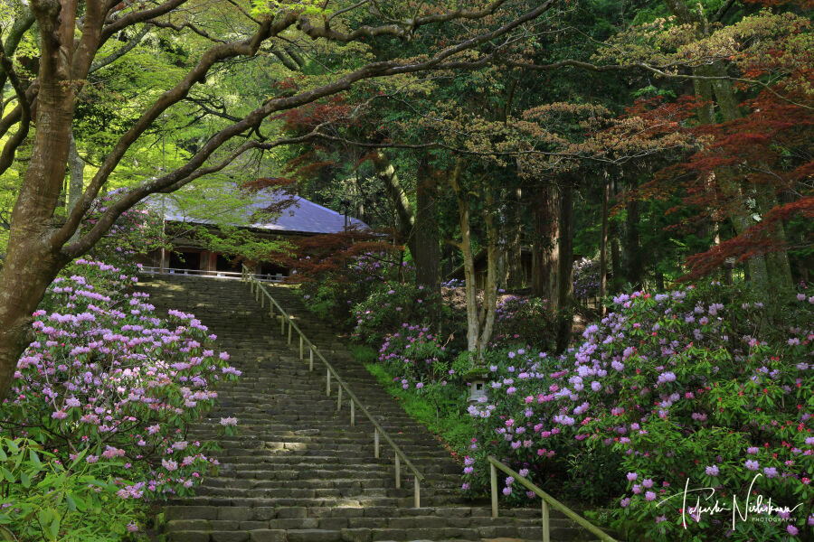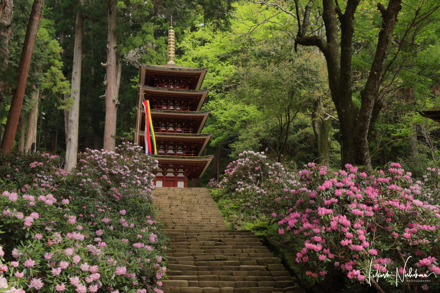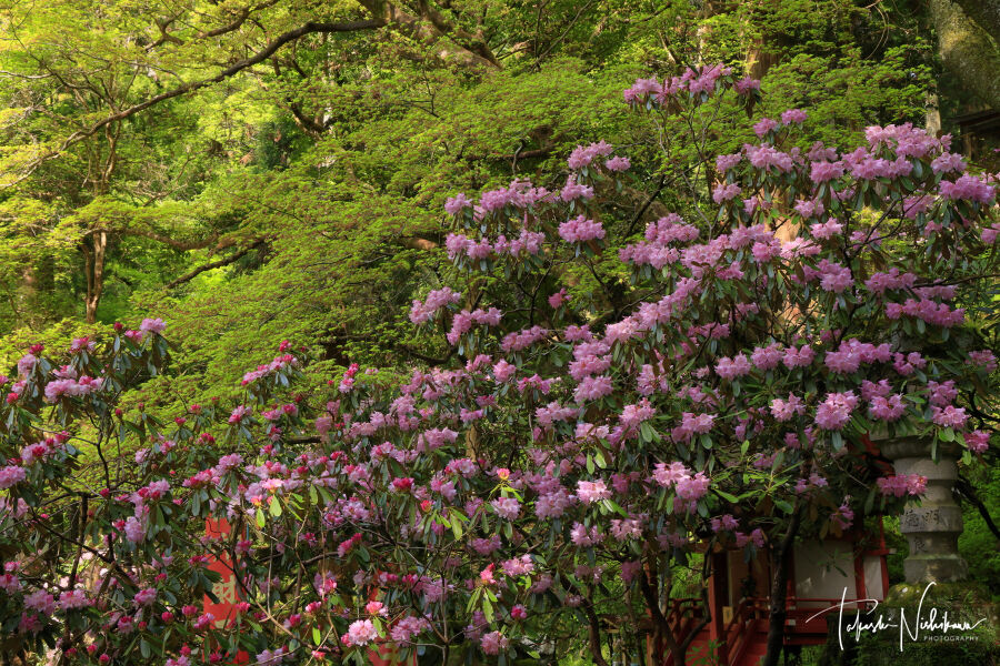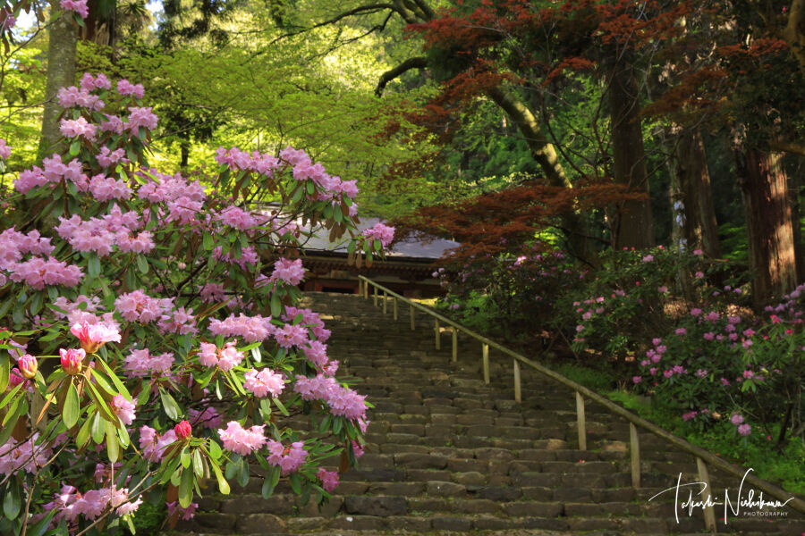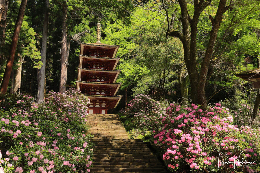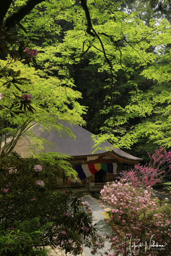 2023年04月21日 奈良県宇陀市の室生寺の石楠花 4月21日分3-1。 奈良県宇陀市の室生寺の石楠花 4月21日分3-1。昨日の室生寺、花付きは良かったのだが、天気予報が曇りに反してピーカンで、コントラストがちがちでいまいちだったので、リベンジすることにした。自分の足のケガで、2週間ほど母を大したところに連れて行ってあげられてないので、今日は久しぶりに一緒に外出。認知症なので、行っても速攻忘れられてしまうのが、残念なのだが。朝6時50分ごろに斑鳩の自宅を出て、8時20分ごろに室生寺へ。一番近い駐車場は600円、周辺の駐車場は500円。昨日の時点では曇り予報だったのに、今日も高曇りよりは晴れに近い天気。GPVでは結構雲かかってたので、雲が出てくることに期待。8時半から拝観開始、拝観600円、JAF割で500円。朝一からカメラマンも数名。http://www.murouji.or.jp/今年は石楠花の見頃が早く現在見頃後半の感じ、花付きもすごく良い。少し傷み始めてるのもあるので、早めがおすすめです。最初は日差しがきついので、比較的影が多い鎧坂で撮影。昨日もちらっと見かけたのだが、現在奈良県在住で世界的写真家のMさんにばったり。FBつながりのOさんとも久しぶりにお会いできた。事前に知っていたわけではないのだが、今日は「弘法大師生御影供」の法要が行われていた。空海(弘法大師)は835年3月21日に入定(没)で、これを新暦に換算して4月21日に行われる。「弘法大師生御影供」は、東寺でも行われている。月命日の毎月21日の弘法市は有名ですね。五色の幕や吹流しは、特別な行事の時だけしか使われない。陰陽五行説から来ているもので、五正色幕とか五間色幕と呼ばれる。吹流しは、五色幡という。待ってると雲が出てきて、陰ってコントラストが弱くなった時に撮影。リベンジで再訪してよかった。雨上がりだとさらに最高だけど、欲張りすぎか。 タグ :#奈良県#宇陀市#室生寺#石楠花