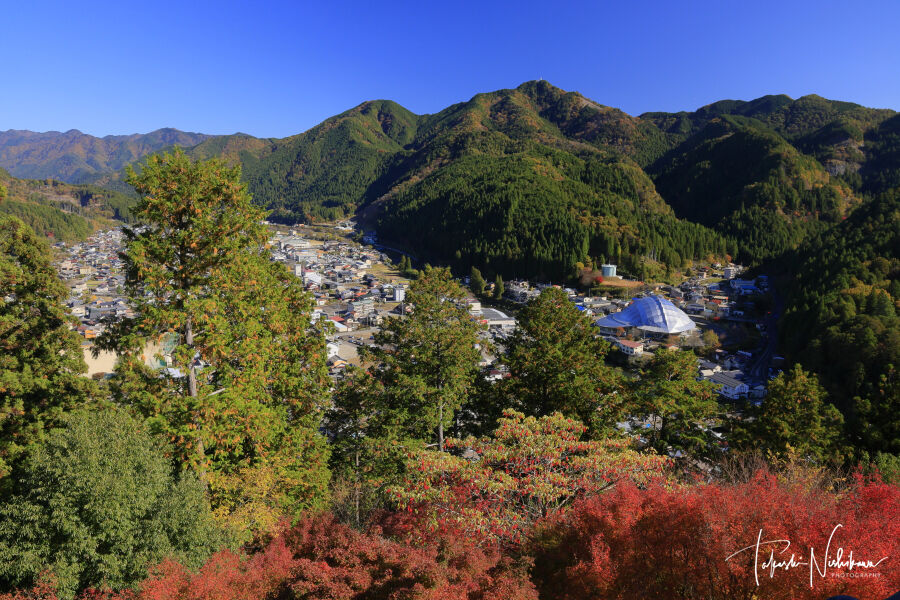紅葉は斜光でいい感じ。展望ポイント手前の紅葉は半散り。