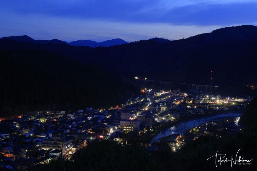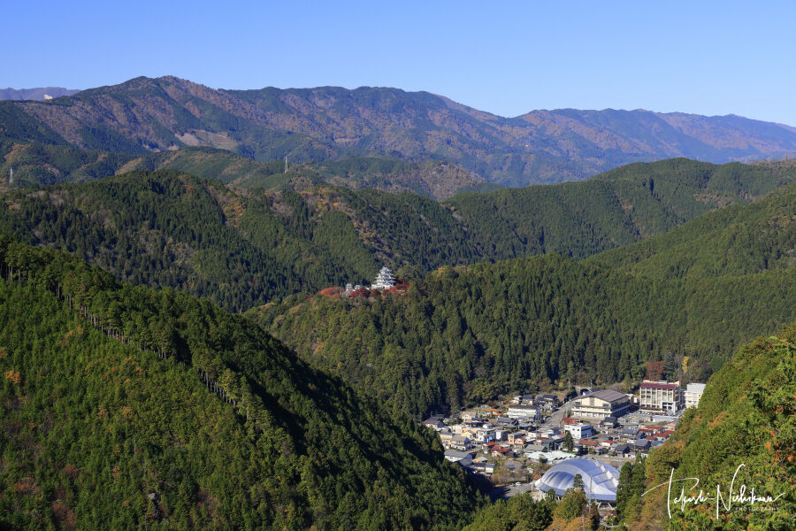 宮ヶ瀬橋からの眺め。奥に郡上八幡城が見える。