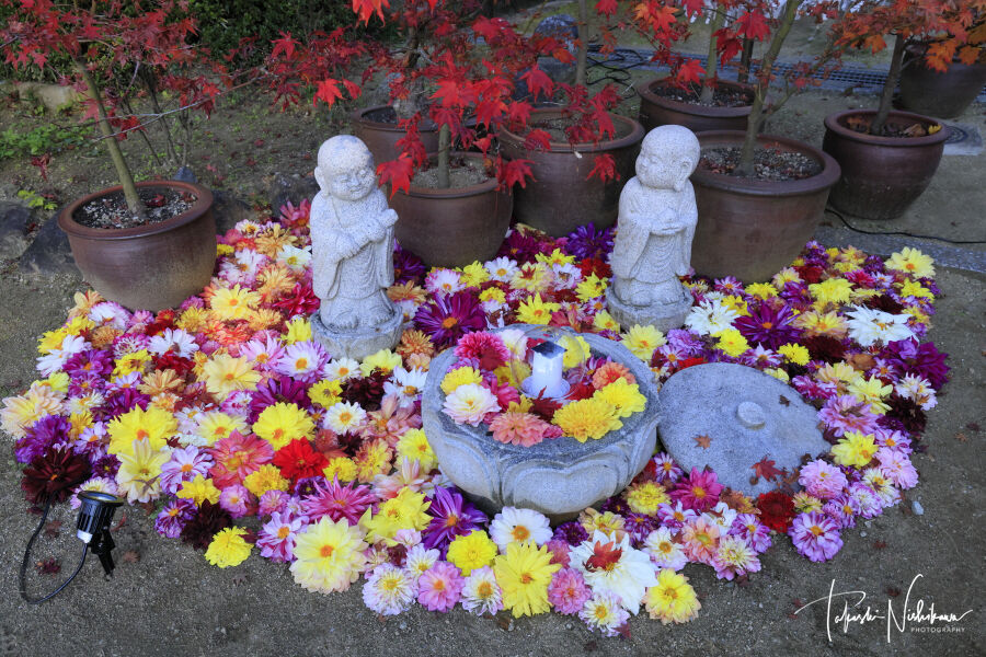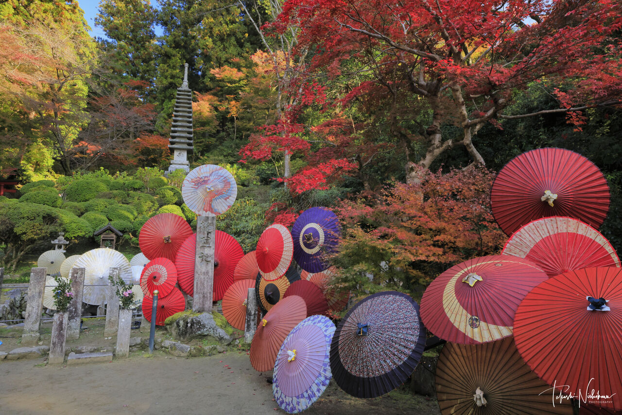 拝観500円。紅葉は見頃。和傘アートの展示あり。