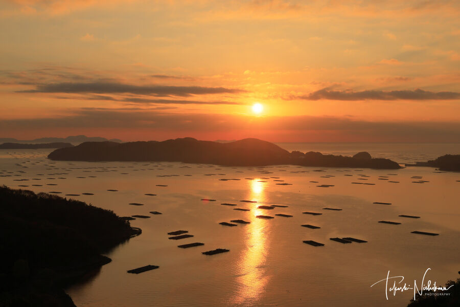 大平山へ続く国道465号線の撮影ポイントから、虫明湾と朝日を撮影。