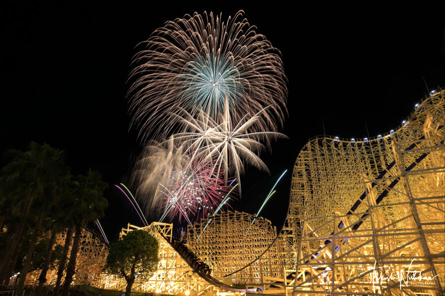 花火は3枚を比較明合成。ジェットコースターは事前に高感度で撮影して合成。