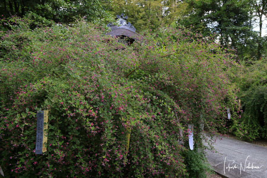 参道の萩は見頃旬。白い方は結構花がついていたが、赤い方は花が少なめ。
