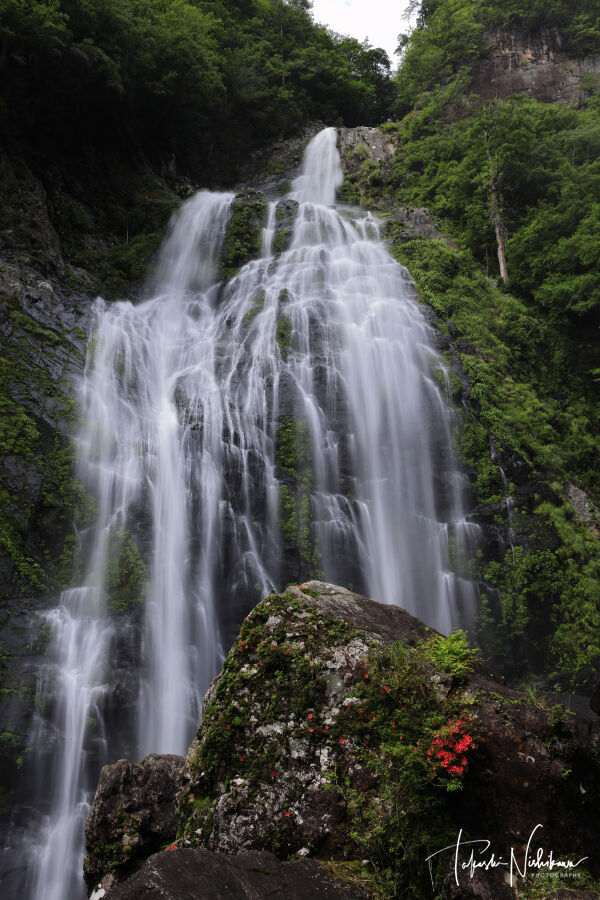 滝周辺にはツツジが咲いていました。落差85mの豪快な滝です。