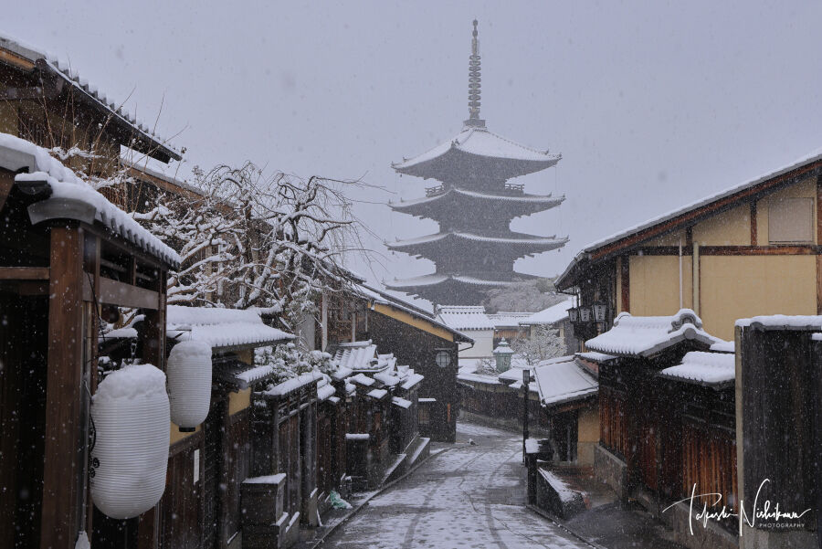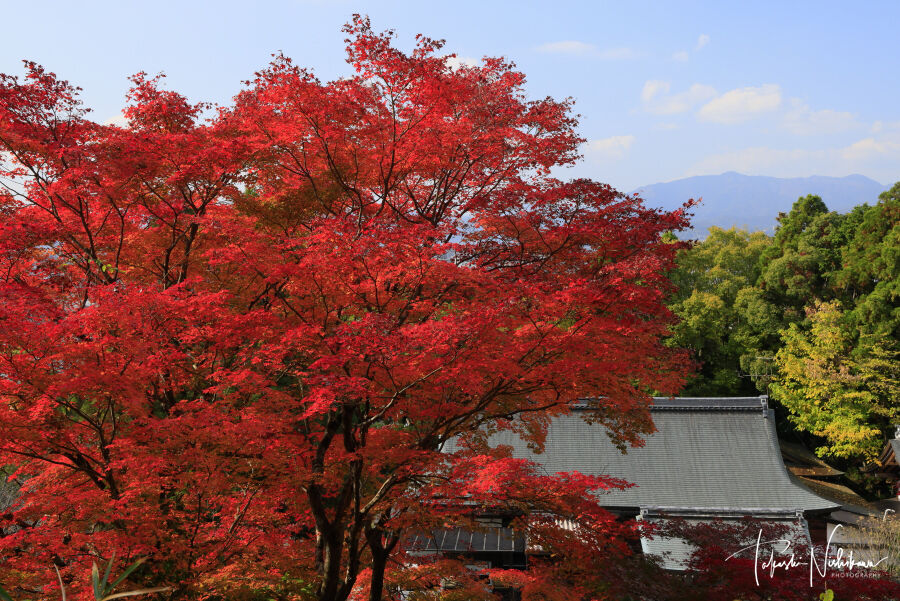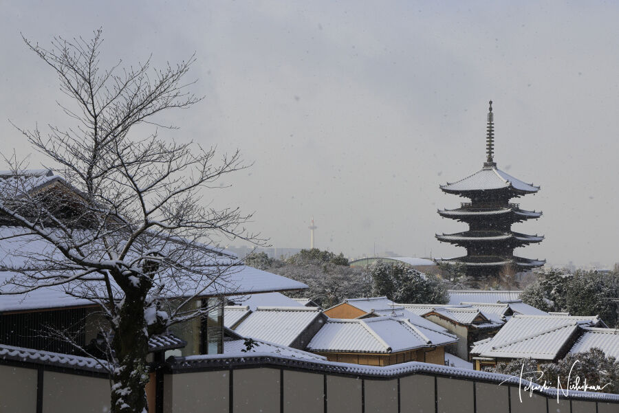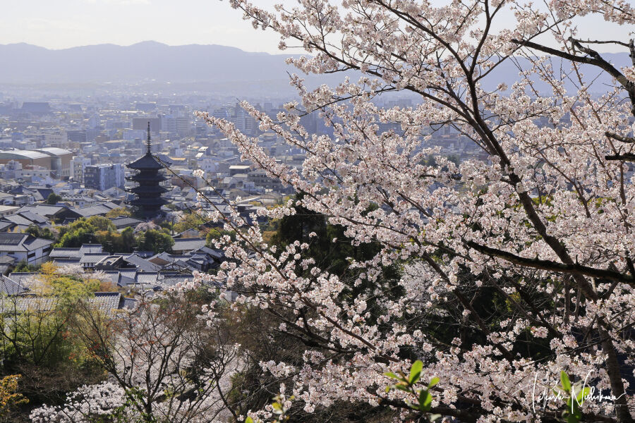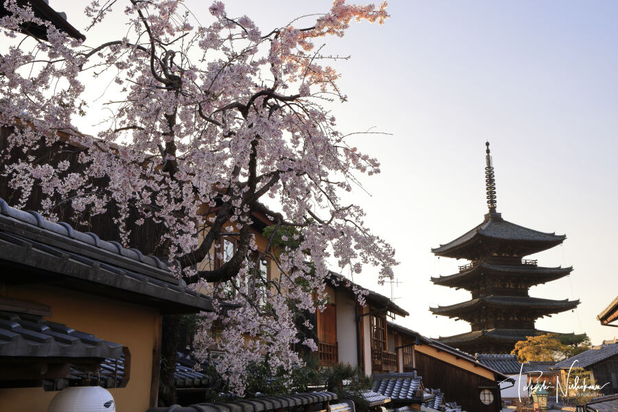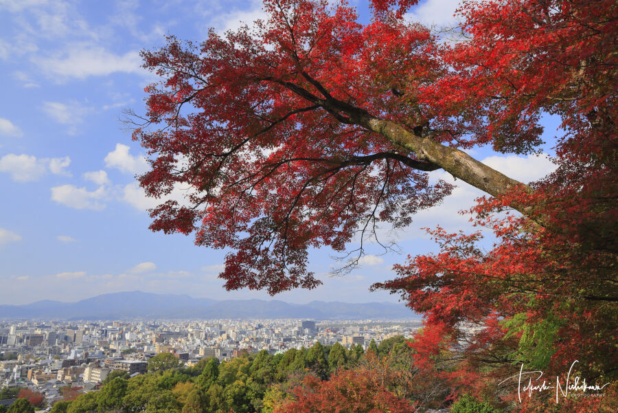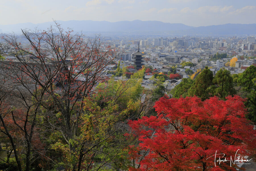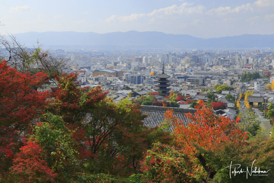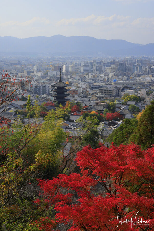 京都霊山護国神社の紅葉と八坂の塔の夕景。